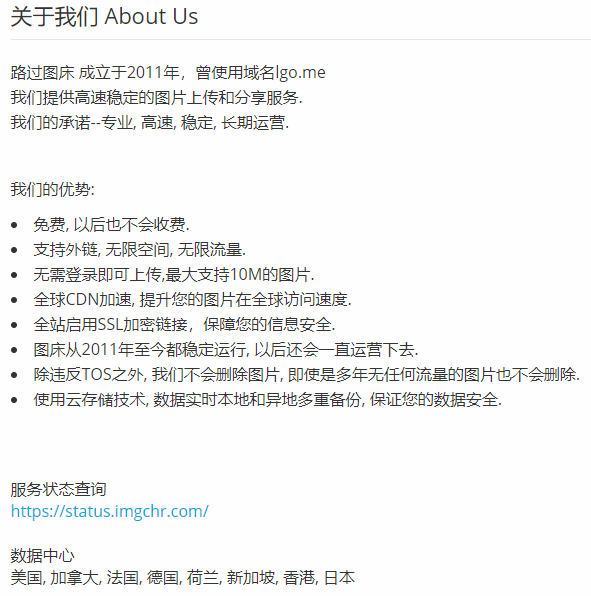 微博图床的特点是免费,没有容量限制,全网 CDN 加速,支持 HTTPS,到哪里都很快。但是免费的服务也有不足的地方,上传的图片会被转成 jpg,图片中可能加上了肉眼难以识别的水印,另外微博的图片鉴别服务也可能会随时删除你的图片。