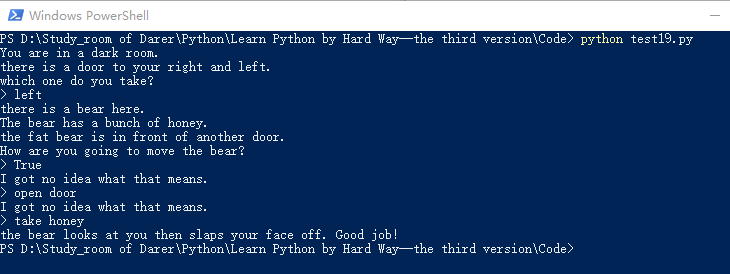 def print next=raw_input("> " if how_much=int(next) else dead("man,learn to type a number." if print exit(0 else dead("You greedy bastard!" def print print print print bear_moved=False while next=raw_input("> " if dead("the bear looks at you then slaps your face off." elif print bear_moved=True elif dead("the bear gets pissed off and chews your leg off." elif gold_room() else print def print print print next=raw_input("> " if start() elif dead("well that was tasty!" else cthulhu_room() def print exit(0 def print print print next=raw_input("> " if bear_room() elif cthulhu_room() else dead("you stumble around the room until you starve." start()
